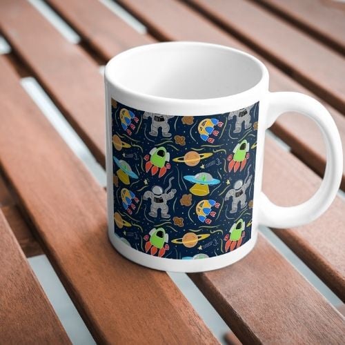 This cute seamless pattern features various color hand-drawn astronaut, spaceships, and meteorites on dark blue paper background – perfect for fabric printing, wrapping paper, kids' products, and more.